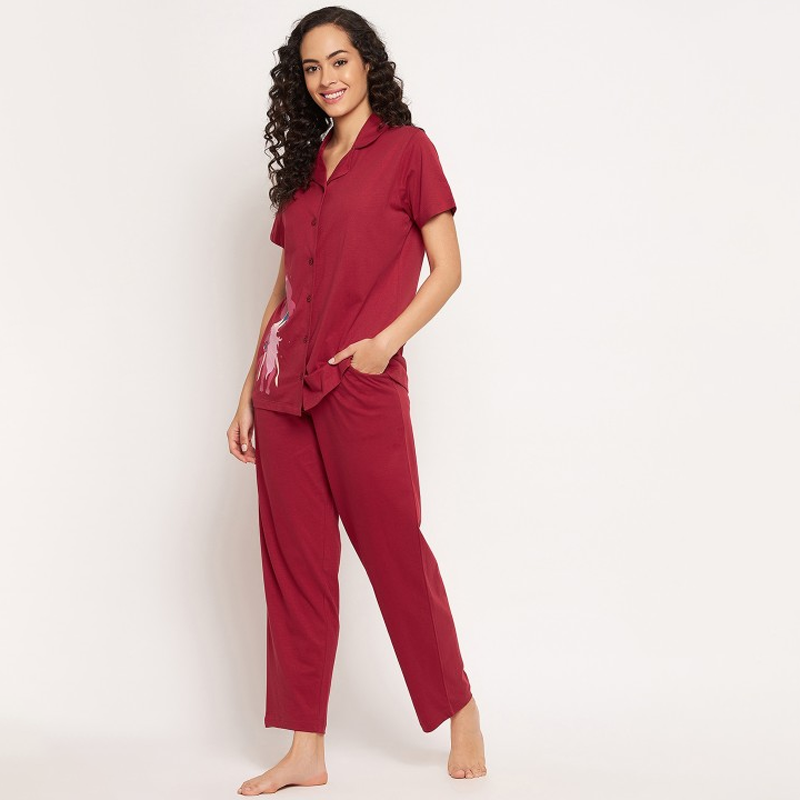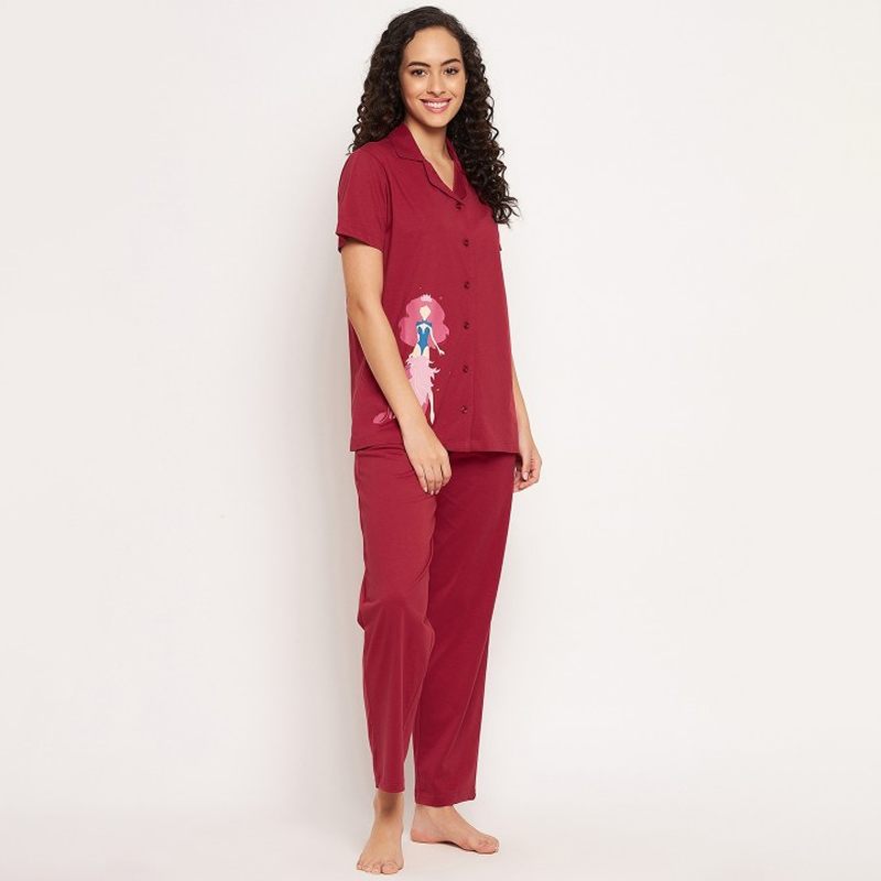 Women Maroon Printed Night suit